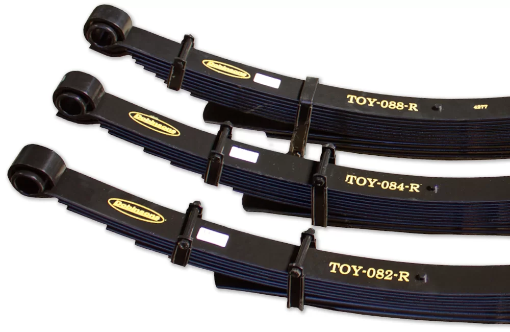 Design features include Drawn, tapered and thinned leaf ends for even stress distribution over the entire spring pack, two stage spring design for the rear of most vehicles to achieve optimum ride and handling both laden and unladen and carefully selected leaf lengths and thickness’s to maximize the spring life, comfort, load carrying capacity, wheel travel and performance.